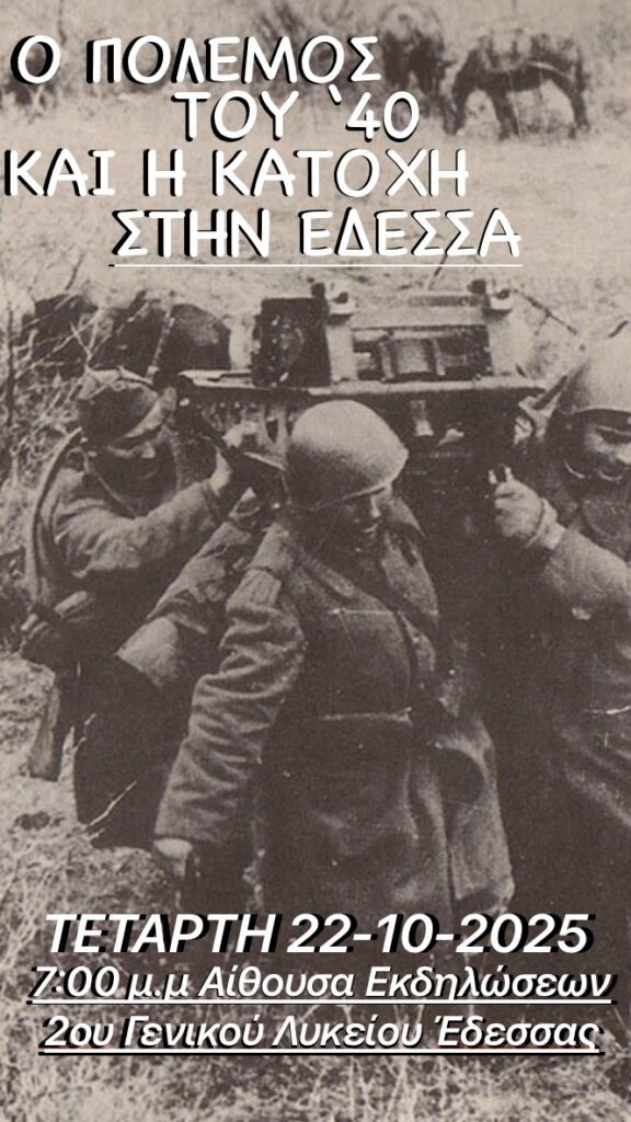 Σας προσκαλούμε στην επετειακή εκδήλωση που οργάνωσαν οι μαθητές και μαθήτριες του σχολείου μας με θέμα: «Ο πόλεμος του ’40 και η περίοδος της Κατοχής στην Έδεσσα».