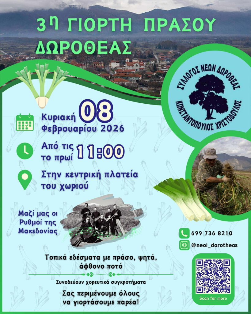 Με ανυπομονησία περιμένουν οι κάτοικοι και επισκέπτες την 3η Γιορτή Πράσου, που θα πραγματοποιηθεί την Κυριακή 8 Φεβρουαρίου 2026, στην κεντρική πλατεία του χωριού Δωροθέα Αλμωπίας. Η εκδήλωση, που διοργανώνεται από τον Σύλλογο Νέων Δωροθέας “Κωνσταντόπουλος Χριστόδουλος”, υπόσχεται να γεμίσει την ημέρα με μουσική, παραδοσιακές γεύσεις και έντονη διασκέδαση.