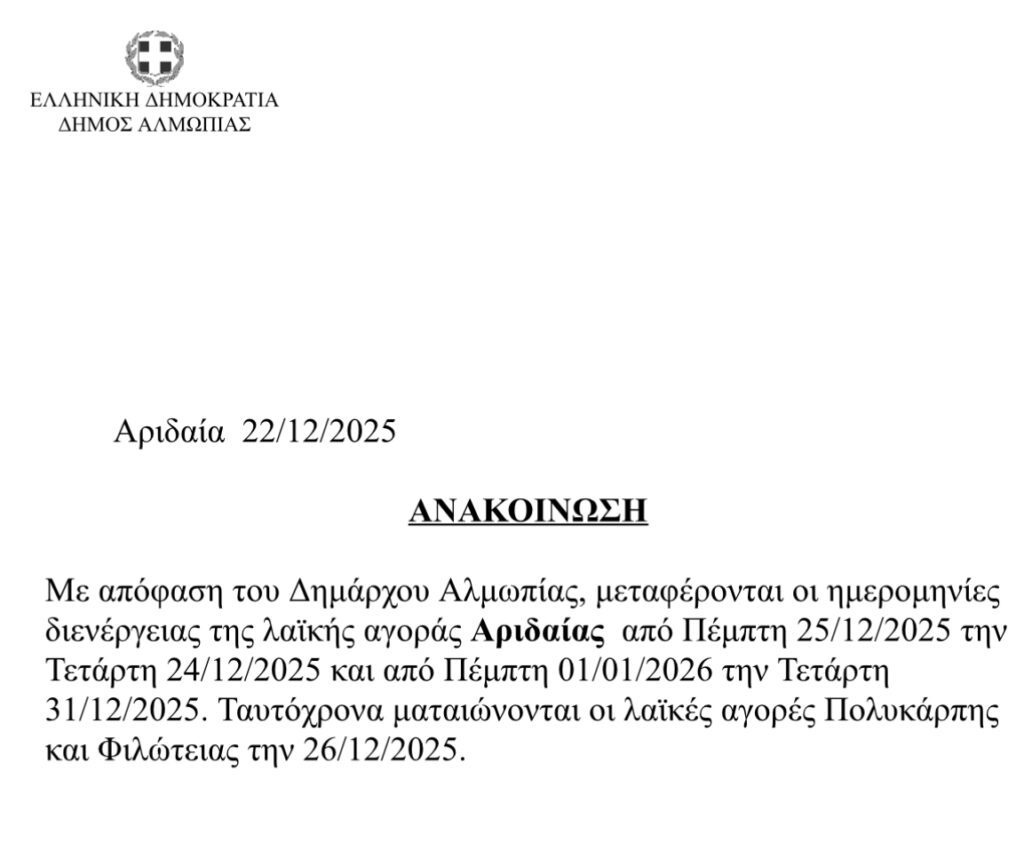 Δείτε τη σχετική ανακοίνωση του Δήμου Αλμωπίας: