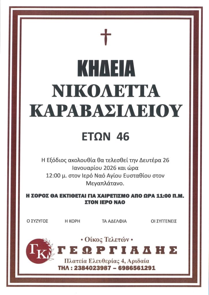 Σε βαθιά θλίψη έχει βυθιστεί ο Μεγαπλάτανος και η ευρύτερη περιοχή της Αλμωπίας από την είδηση του θανάτου της Νικολέττας Καραβασιλείου, η οποία έφυγε από τη ζωή σε ηλικία μόλις 46 ετών.