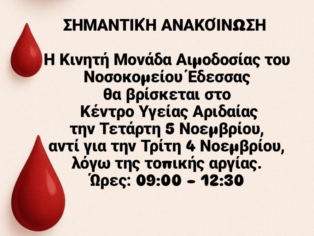 Ανακοίνωση του Κέντρου Υγείας Αριδαίας για την αιμοδοσία: