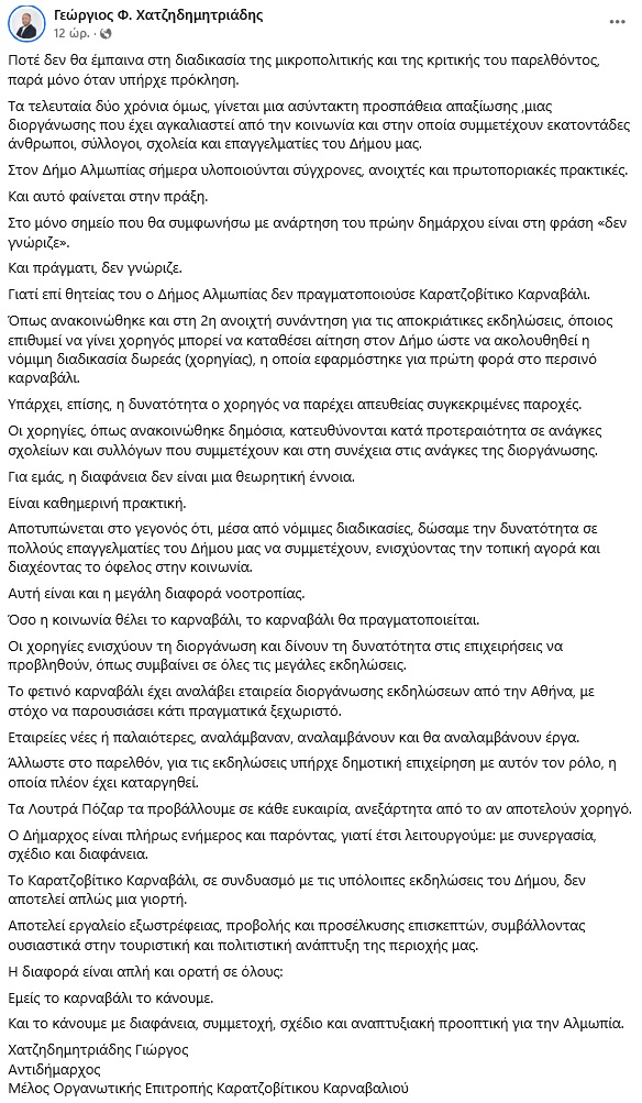 Απαντώντας, ο Αντιδήμαρχος Αλμωπίας και μέλος της Οργανωτικής Επιτροπής του Καρατζοβίτικου Καρναβαλιού Γιώργος Χατζηδημητριάδης απορρίπτει τις αιτιάσεις, κάνοντας λόγο για προσπάθεια απαξίωσης μιας διοργάνωσης που, όπως σημειώνει, έχει αγκαλιαστεί από την τοπική κοινωνία και περιλαμβάνει τη συμμετοχή συλλόγων, σχολείων και επαγγελματιών. Υποστηρίζει ότι ο Δήμος εφαρμόζει σύγχρονες και ανοιχτές πρακτικές και ότι οι χορηγίες πραγματοποιούνται μέσω νόμιμης διαδικασίας δωρεάς, κατόπιν αίτησης προς τον Δήμο, πρακτική που –όπως αναφέρει– εφαρμόστηκε για πρώτη φορά στο περσινό καρναβάλι.