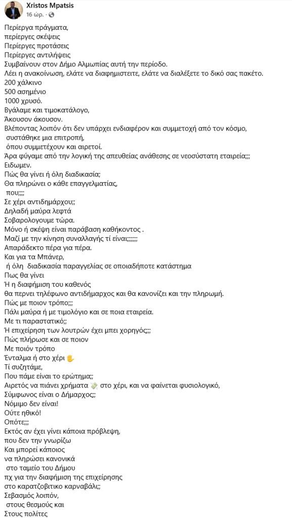 Με ανακοίνωσή του, ο πρώην Δήμαρχος και επικεφαλής της μείζονος αντιπολίτευσης Χρήστος Μπάτσης εκφράζει σοβαρές επιφυλάξεις για τον τρόπο με τον οποίο, όπως αναφέρει, προωθείται η συμμετοχή επαγγελματιών μέσω χορηγικών «πακέτων» συγκεκριμένου χρηματικού ύψους. Στην ανακοίνωσή του θέτει ερωτήματα σχετικά με τη νομιμότητα της διαδικασίας, τον τρόπο είσπραξης των χρημάτων, τον ρόλο αιρετών στη διαχείρισή τους, καθώς και για το αν προβλέπεται θεσμικά η καταβολή ποσών απευθείας στο ταμείο του Δήμου. Παράλληλα, ζητά διευκρινίσεις για τη διαδικασία προμήθειας διαφημιστικών banner και για το αν συμμετέχουν δημοτικές επιχειρήσεις ως χορηγοί και με ποιον τρόπο. Ο κ. Μπάτσης τονίζει ότι οποιαδήποτε διαχείριση χρημάτων από αιρετούς δεν είναι ούτε νόμιμη ούτε ηθική, καλώντας σε σεβασμό προς τους θεσμούς και τους πολίτες.
