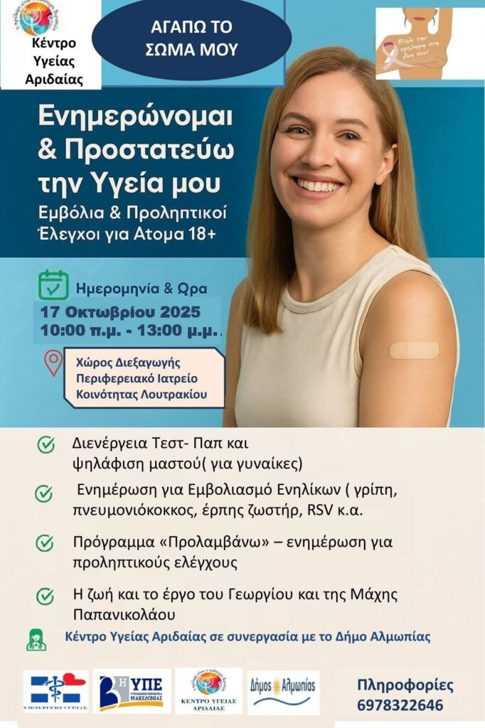Το Κέντρο Υγείας Αριδαίας διοργανώνει τη δράση «Αγαπώ το σώμα μου – Εμβόλια & Προληπτικοί Έλεγχοι για Άτομα 18+» σε συνεργασία με τον Δήμο Αλμωπίας.
