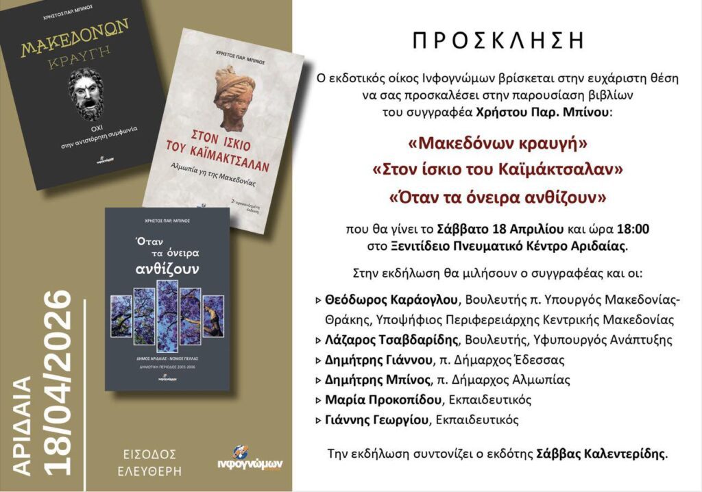 Το Σάββατο 18 Απριλίου 2026, στις 18:00, στο Ξενιτίδειο Πνευματικό Κέντρο Αριδαίας, θα πραγματοποιηθεί η παρουσίαση των βιβλίων του συγγραφέα Χρήστου Παρ. Μπίνου: