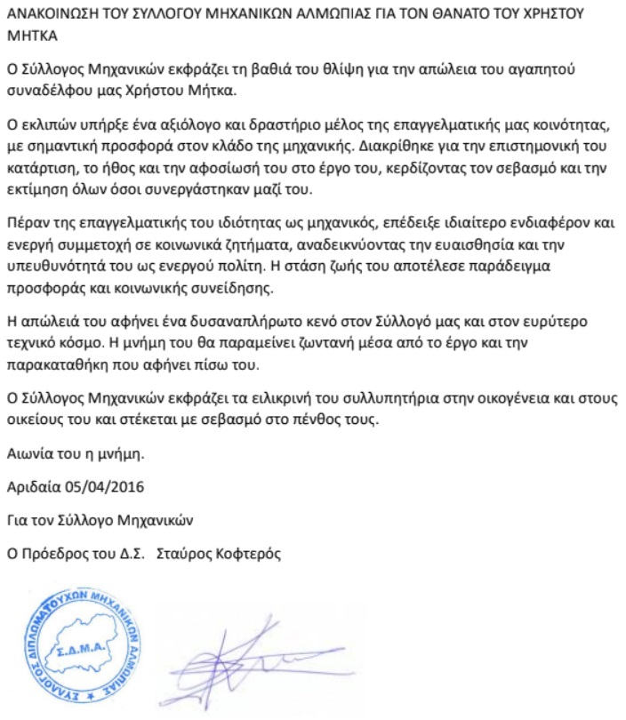 Συλλυπητήριο μήνυμα του Συλλόγου Μηχανικών Αλμωπίας για τον θάνατο του Χρήστου Μήτκα: