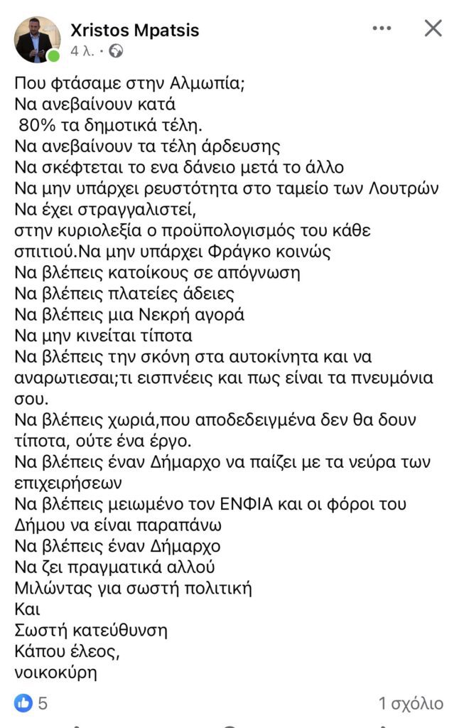 Ο ίδιος κατηγορεί τη δημοτική αρχή για έλλειψη ρευστότητας, συνεχή προσφυγή σε δανεισμό και αδυναμία στήριξης βασικών δομών, όπως τα Λουτρά. Παράλληλα, περιγράφει μια τοπική κοινωνία σε ύφεση, με «νεκρή αγορά», άδειες πλατείες και κατοίκους σε απόγνωση, ενώ κάνει ιδιαίτερη αναφορά και σε ζητήματα, όπως η σκόνη και οι επιπτώσεις της στην υγεία.