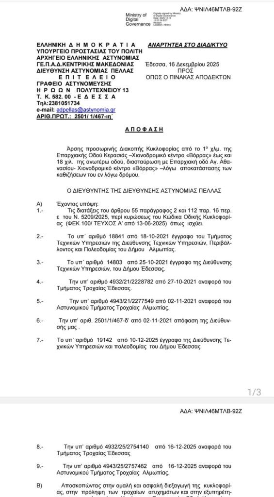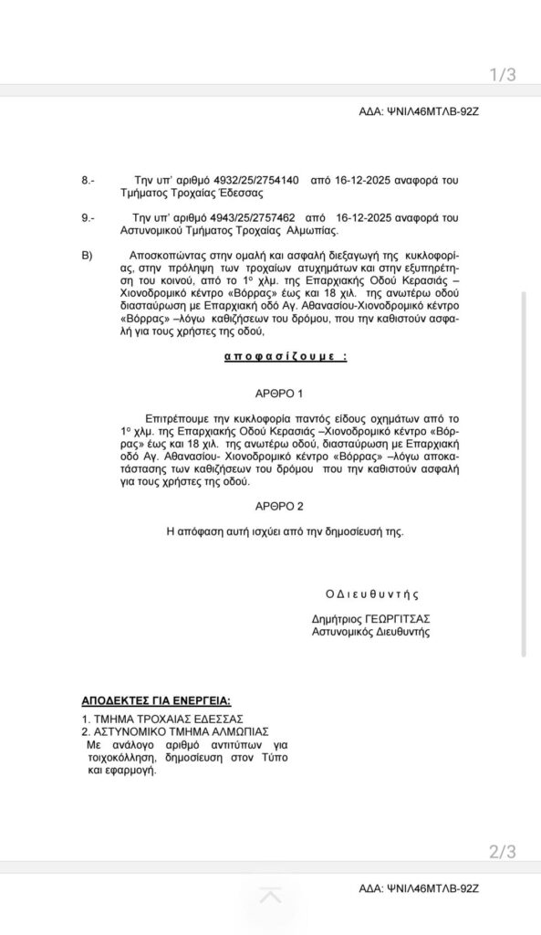 Μόλις λάβαμε την επίσημη απόφαση της Αστυνομικής Διεύθυνσης Πέλλας, με την οποία επιτρέπεται πλέον η κυκλοφορία στον δρόμο Κερασιάς – Χιονοδρομικού.