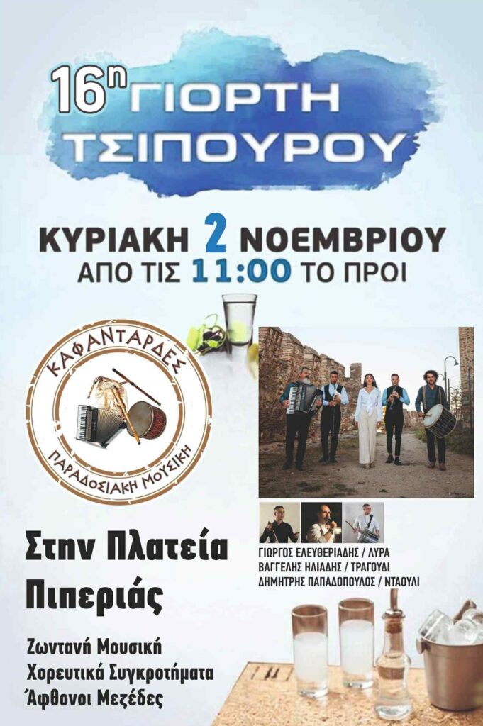 Η Πιπεριά ετοιμάζεται και φέτος να υποδεχθεί μια από τις πιο αγαπημένες και παραδοσιακές εκδηλώσεις της περιοχής — την 16η Γιορτή Τσίπουρου, που θα πραγματοποιηθεί την Κυριακή 2 Νοεμβρίου από τις 11:00 το πρωί στην πλατεία του χωριού.