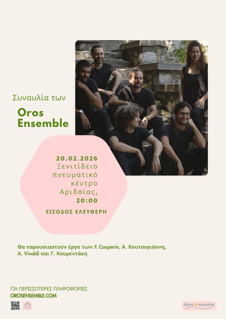 Άλλη μια δυνατή καλλιτεχνική σύμπραξη στο Δήμος Αλμωπίας σε συνεργασία με την Εθνική Λυρική Σκηνή -ΕΛΣ-. Το μουσικό σύνολο “Oros Ensemble” ταξιδεύει στην Αριδαία για να παρουσιάσει ένα ξεχωριστό μουσικό πρόγραμμα με επίτιμο προσκεκλημένο τον συνθέτη και καλλιτεχνικό διευθυντή της ΕΛΣ Γιώργο Κουμεντάκη.