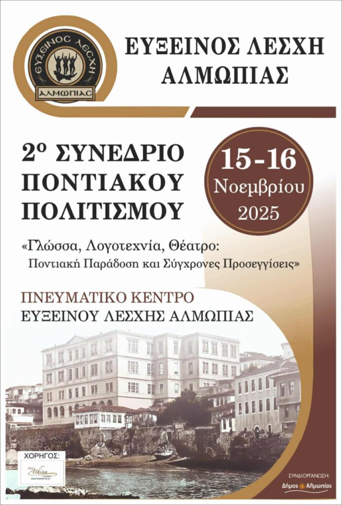 Η Εύξεινος Λέσχη Αλμωπίας διοργανώνει το 2ο Συνέδριο Ποντιακού Πολιτισμού «Γλώσσα, Λογοτεχνία, Θέατρο: Ποντιακή Παράδοση και Σύγχρονες Προσεγγίσεις», που θα διεξαχθεί στις 15 και 16 Νοεμβρίου 2025, στο Πνευματικό Κέντρο της Ευξείνου Λέσχης Αλμωπίας.