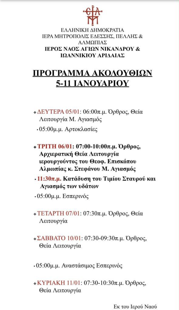 Με ιδιαίτερη λαμπρότητα και σε κλίμα κατάνυξης θα πραγματοποιηθεί και φέτος η κοινή ρίψη του Τιμίου Σταυρού στην Αριδαία, στο πλαίσιο του εορτασμού των Θεοφανείων, από τις δύο ενορίες της πόλης, τον Ιερό Ναό Αγίων Νικάνδρου και Ιωαννικίου και τον Ιερό Ναό Αγίου Αντωνίου.