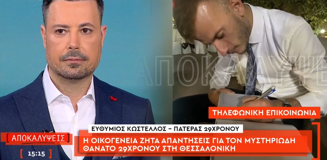 Ο πατέρας του, Ευθύμιος Κωστέλλος, περιγράφει τις τελευταίες επικοινωνίες με τον γιο του, οι οποίες –όπως λέει– ήταν ιδιαίτερα ανησυχητικές. «Με πήρε τηλέφωνο και ήταν αγχωμένος, δεν τον είχα ξανακούσει έτσι. Μου είπε “πατέρα, τα έχω κάνει σκατά… είναι αίρεση και φοβάμαι για εσάς”», αναφέρει, προσθέτοντας ότι ο 29χρονος δεν επικοινώνησε ξανά μαζί του.