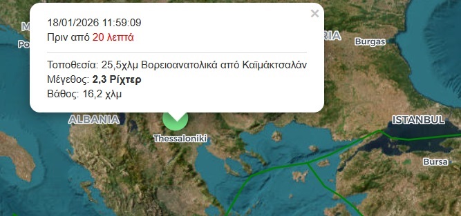 Ασθενής σεισμική δόνηση σημειώθηκε πριν από λίγο στην περιοχή της Αλμωπίας, στη βόρεια Ελλάδα. Σύμφωνα με τα διαθέσιμα στοιχεία, ο σεισμός καταγράφηκε στις 11:59 το πρωί της 18ης Ιανουαρίου 2026, με μέγεθος 2,3 βαθμών της κλίμακας Ρίχτερ.