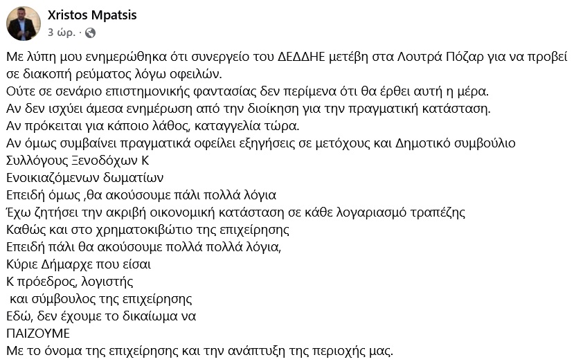 Απάντηση του Διευθυντή των Λουτρών Πόζαρ Νικηφόρου Παπαγιαννόπουλου στην ανάρτηση του πρώην Δημάρχου και επικεφαλής της παράταξης «Εδώ Ζούμε» Χρήστου Μπάτση: