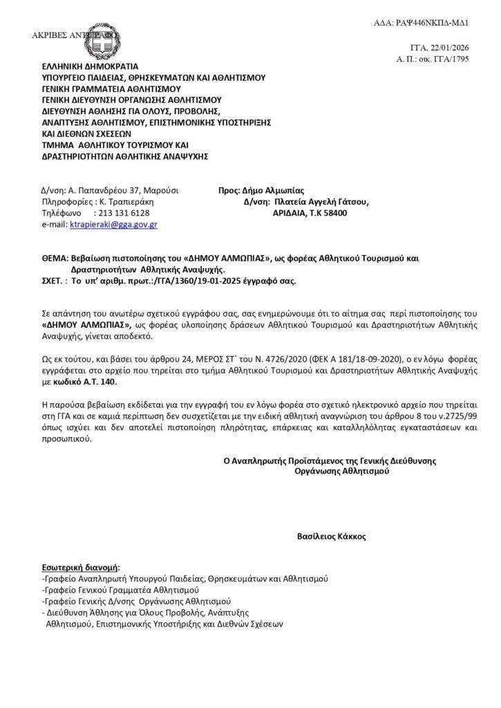 Η πιστοποίηση χορηγήθηκε από το Υπουργείο Παιδείας, Θρησκευμάτων και Αθλητισμού και συγκεκριμένα από τη Γενική Γραμματεία Αθλητισμού, έπειτα από την αποδοχή του σχετικού αιτήματος του Δήμου. Με την απόφαση αυτή, ο Δήμος Αλμωπίας εγγράφεται επίσημα στο μητρώο φορέων που υλοποιούν δράσεις αθλητικού τουρισμού και αθλητικής αναψυχής, αποκτώντας θεσμική υπόσταση και δυνατότητα περαιτέρω ανάπτυξης στον συγκεκριμένο τομέα.