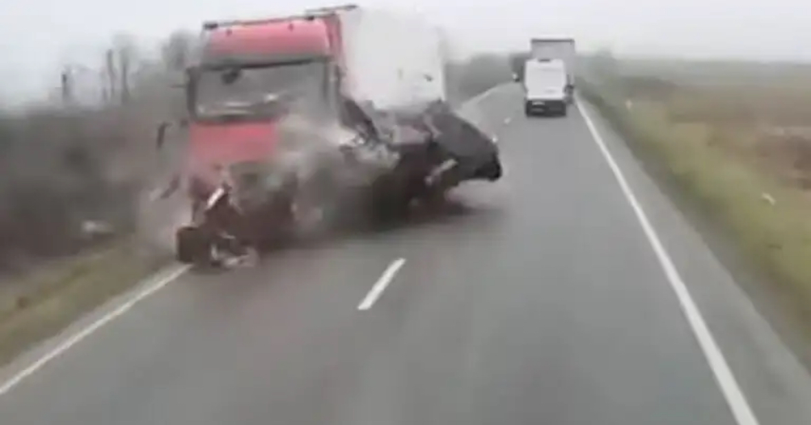 Στη προσπάθεια του να επιστρέψει στη λωρίδα του, συγκρούστηκε με μία βυτιοφόρο και εκφενδονίστηκε στην αντίθετη κατεύθυνση, όπου συγκρούστηκε με ένα φορτηγό.