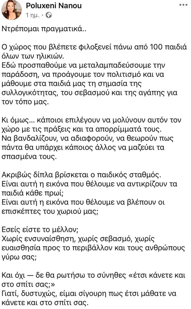 Η κ. Νάνου, σε μια ανάρτηση γεμάτη συναίσθημα και απογοήτευση, τονίζει πως ο συγκεκριμένος χώρος αποτελεί σημείο πολιτισμού και εκπαίδευσης, όπου γίνεται προσπάθεια να μεταλαμπαδευτούν στα παιδιά αξίες όπως η παράδοση, ο σεβασμός, η συλλογικότητα και η αγάπη για τον τόπο τους. Παρ’ όλα αυτά, όπως σημειώνει, κάποιοι επιλέγουν να μολύνουν και να βανδαλίζουν τον χώρο, αδιαφορώντας πλήρως για τις συνέπειες των πράξεών τους.