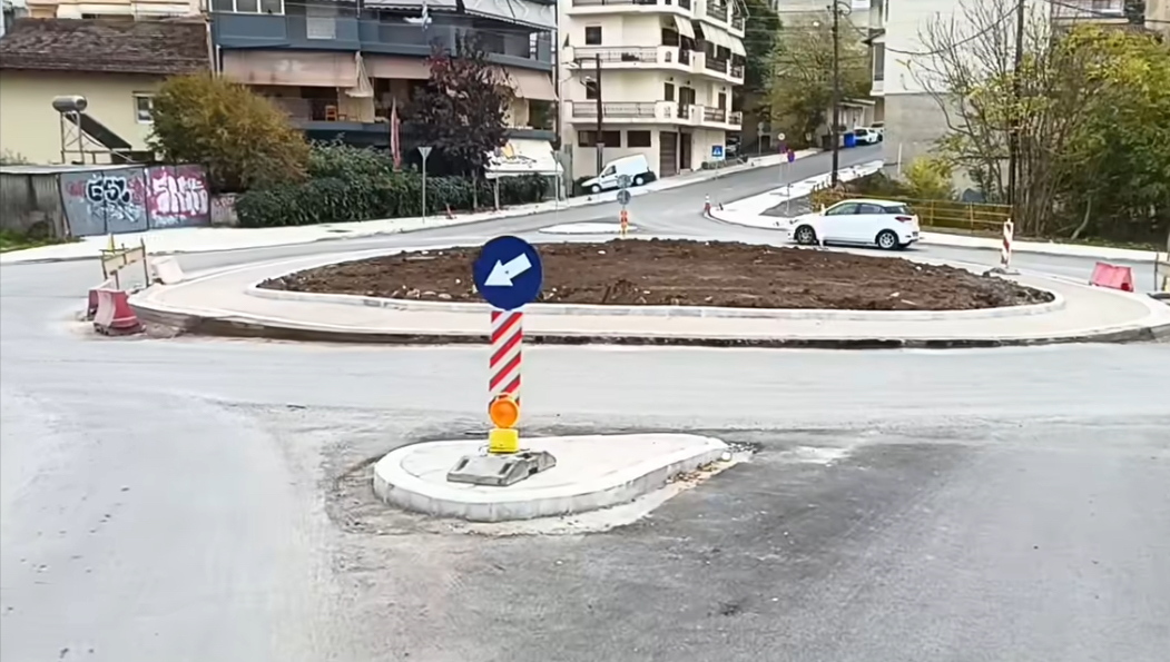 Στο σημείο έχει τοποθετηθεί προσωρινή σήμανση για τη ρύθμιση της κυκλοφορίας κατά τη διάρκεια των έργων. Ωστόσο, μία πινακίδα φαίνεται να έχει τοποθετηθεί λανθασμένα, υποδεικνύοντας κατεύθυνση που μπορεί να οδηγήσει σε παρεξήγηση ή ακόμα και κίνδυνο για τους οδηγούς, καθώς φαίνεται να στέλνει την κυκλοφορία στο αντίθετο ρεύμα του κόμβου.