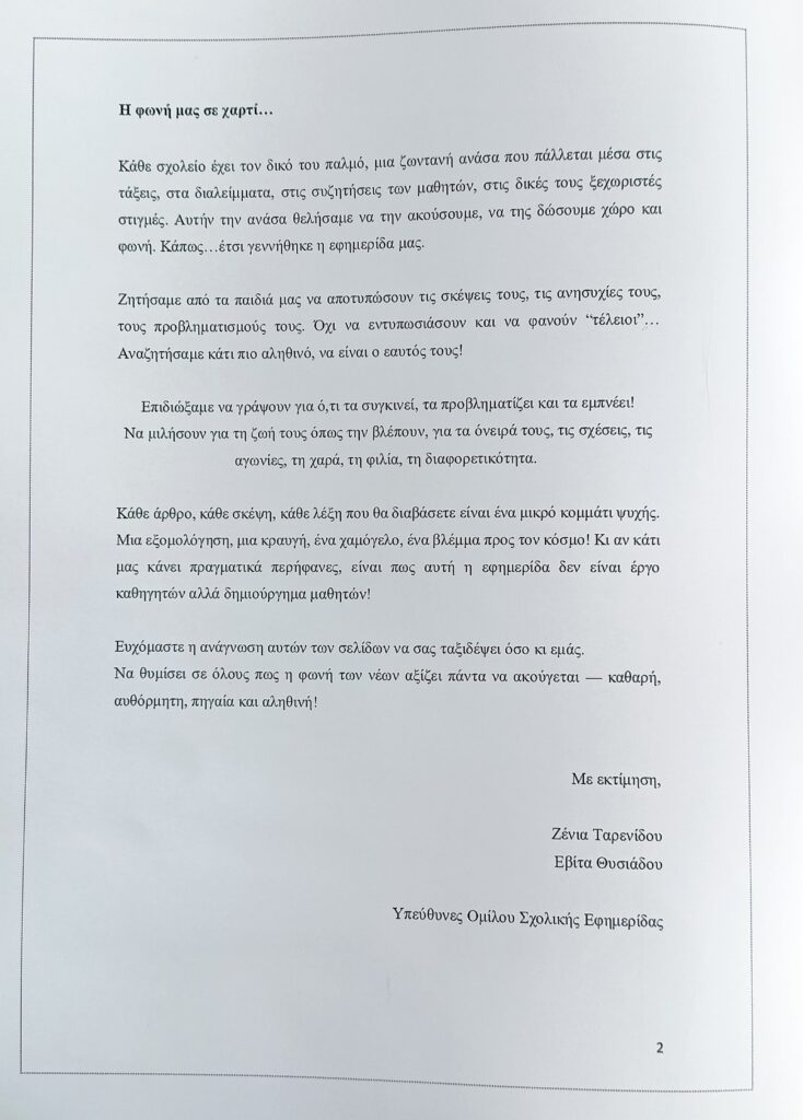 Η έκδοση αυτή αποτελεί μια ζωντανή απόδειξη ότι το σχολείο μπορεί να είναι χώρος έκφρασης, σκέψης και δημιουργίας!