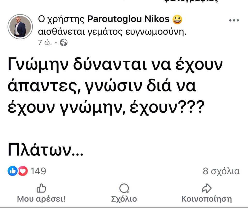 Ο κ. Μπάτσης κάνει λόγο για «δόγμα» της λογικής «τα ξέρω όλα – δεν θέλω κριτική», αφήνοντας σαφείς αιχμές για τη στάση της Δημοτικής Αρχής απέναντι στην αντίθετη άποψη. Με έντονα ειρωνικό τόνο, αναφέρεται στον «Πλάτωνα του σύγχρονου εκ Αλμωπίας», υποστηρίζοντας ότι, σύμφωνα με τη συγκεκριμένη λογική, όποιος εκφράζει γνώμη ή άποψη αποκλείεται και δεν έχει δικαίωμα δημόσιου λόγου.Στην ανάρτησή του, ο επικεφαλής της αντιπολίτευσης υπογραμμίζει ότι η κριτική αντιμετωπίζεται ως κάτι ανεπιθύμητο, ενώ καταλήγει με τη φράση ότι «εμείς οι αγράμματοι δεν έχουμε δικαίωμα ελεύθερης άποψης», ενισχύοντας το μήνυμα περί απαξίωσης όσων εκφράζουν διαφορετική άποψη από τη Δημοτική Αρχή.