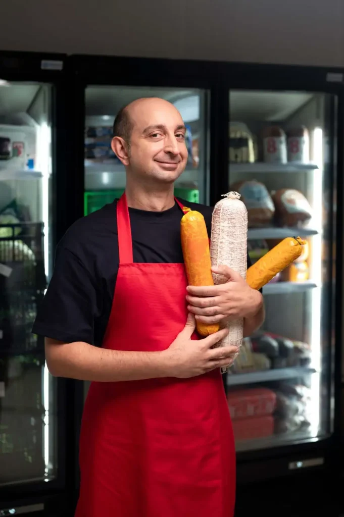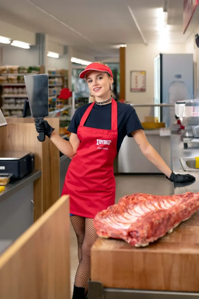Αγέρωχη, ψαρωτική και οξύθυμη στον χαρακτήρα… ξανθιά, με μακριά μαλλιά και σώμα μοντέλου στην εμφάνιση… η Χαριστέλλα είναι η πιο ετερόκλιτη χασάπισσα στην ιστορία της ανθρωπότητας. Πειραιώτισσα με πατέρα μεγαλοχασάπη και μάνα τεχνίτρια νυχιών, σπούδασε γυμνάστρια, όμως η πτώχευση του οικογενειακού χασάπικου και το εγκεφαλικό του πατέρα της, της άλλαξαν τα σχέδια. Εκμεταλλευόμενη την άδεια χασάπη, που ο πατέρας της την ανάγκασε να βγάλει, βρήκε δουλειά στο ΣΟΥΠΕΡ για να στηρίξει τους δικούς της. Γι’ αυτό δουλεύει πολύ, μιλάει λίγο, βάζει στη θέση του κάθε πελάτη που τη χαζεύει και γενικά… δεν σηκώνει μύγα στον μπαλτά της. Άλλωστε, όλο αυτό δεν είναι το όνειρό της. Δεν τρώει καν κρέας. Είναι vegan, προοδευτική, αλλά όχι ψευτο-επαναστάτρια. Εντάξει, λέει ότι θα παραιτηθεί κάθε εβδομάδα, αλλά πια έχει γίνει το εσωτερικό αστείο του μαγαζιού. Αν και απειλητική και αγέλαστη, τα πάει καλά με όλους τους συναδέλφους της, εκτός απ’ τον Περικλή, με τον οποίο έχει μόνιμη κόντρα. Κατά βάθος, η Χαριστέλλα είναι μια μοντέρνα εργαζόμενη κοπέλα, που κάνει μια δουλειά που δεν την τρελαίνει, αλλά τη θέλει για να μαζέψει λεφτά. Και θα το κατάφερνε… αν δεν ερχόταν στο ΣΟΥΠΕΡ ο καινούριος διευθυντής.