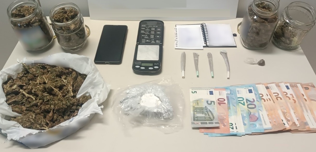 Σε έρευνα που έγινε στην οικία του βρέθηκαν μεταξύ άλλων και κατασχέθηκαν 1 συσκευασία με κοκαΐνη βάρους 22,4 γραμμαρίων, 2 συσκευασίες και 4 γυάλινα βάζα με ακατέργαστη κάνναβη, συνολικού βάρους 380,5 γραμμαρίων, καθώς και μία ηλεκτρονική ζυγαριά ακριβείας.