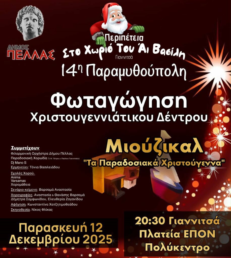 Ο Δήμος Πέλλας σας προσκαλεί στην εκδήλωση φωταγώγησης του Χριστουγεννιάτικου Δέντρου και στα εγκαίνια της 14ης Παραμυθούπολης Γιαννιτσών, που θα πραγματοποιηθούν την Παρασκευή 12 Δεκεμβρίου 2025, στις 8:30 μ.μ., στον πεζόδρομο (Πολύκεντρο – Πλατεία ΕΠΟΝ).