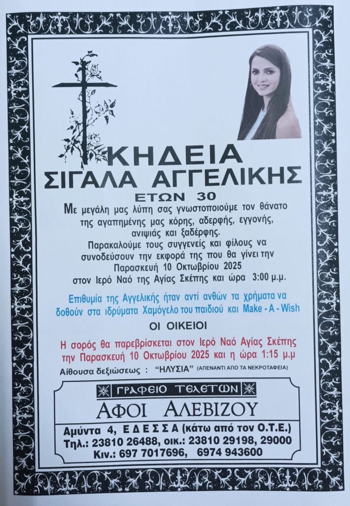 Η Διοικητική Επιτροπή του Επιμελητηρίου Πέλλας σε έκτακτη συνεδρίασή της λόγω του θανάτου της κόρης του κ. Αντωνίου Σιγάλα, Μέλους του Διοικητικού Συμβουλίου του Επιμελητηρίου Πέλλας, αποφάσισε ομόφωνα: