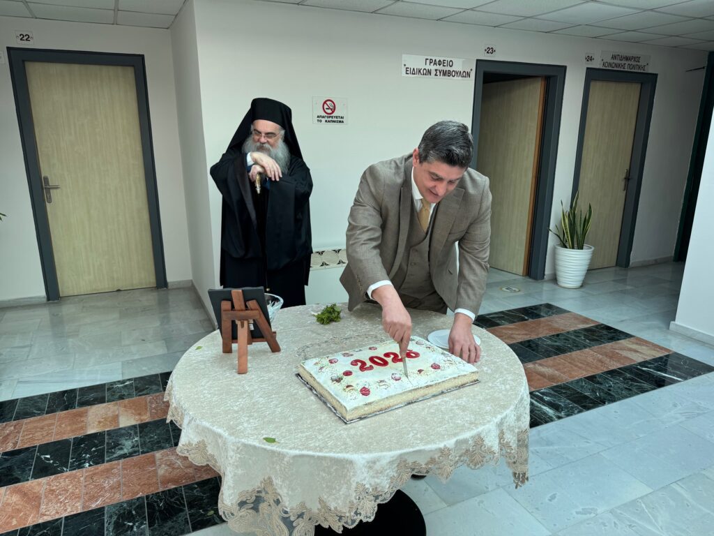 Τη βασιλόπιτα ευλόγησε ο Επίσκοπος Αλμωπίας κ. Στέφανος και στη συνέχεια ο Δήμαρχος προχώρησε στην κοπή της, απευθύνοντας πρωτοχρονιάτικο χαιρετισμό με ευχές για υγεία και μια δημιουργική χρονιά για όλους.