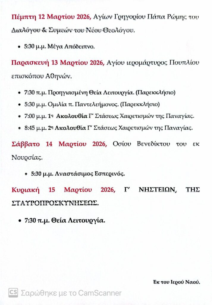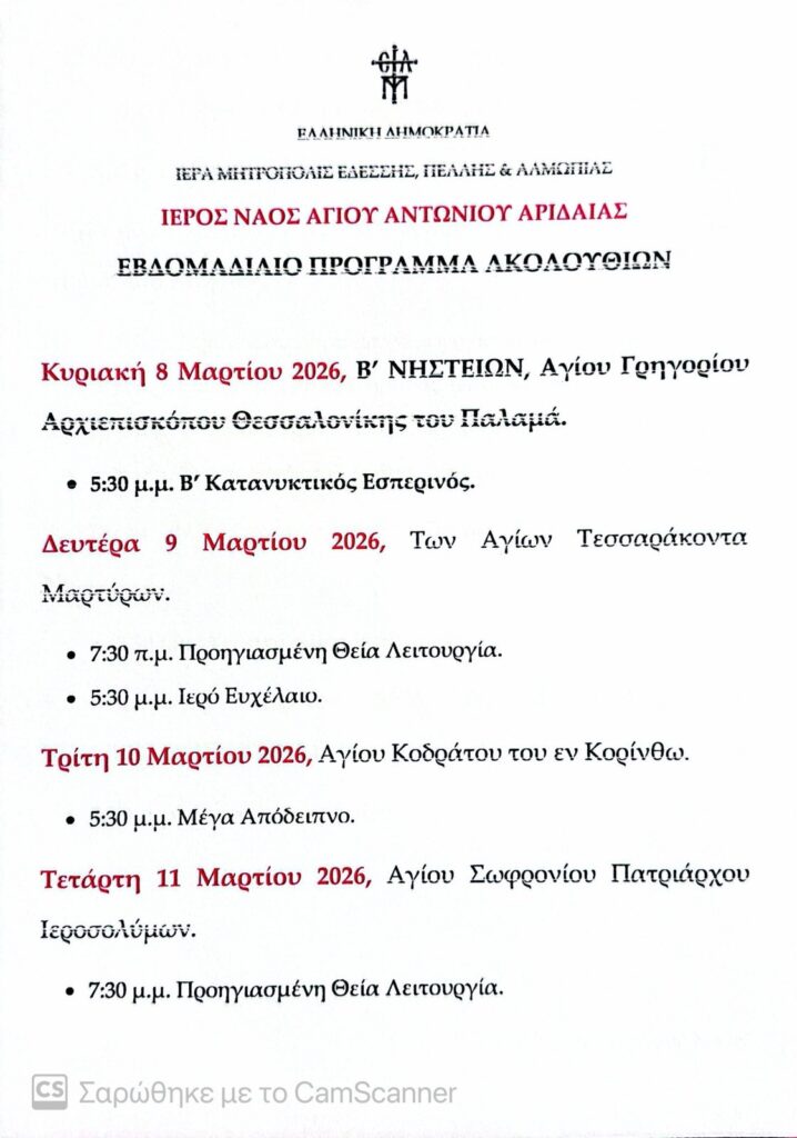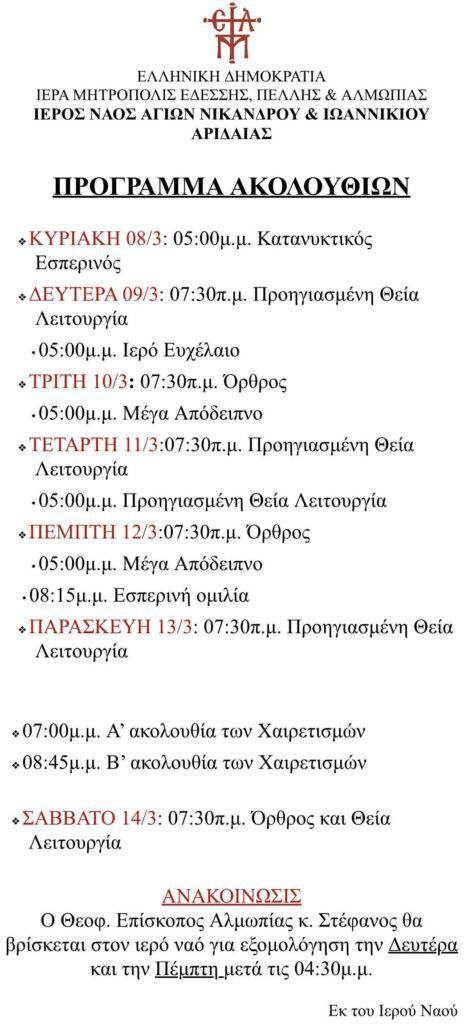 Το πρόγραμμα των ακολουθιών της εβδομάδας στους ναούς της Αριδαίας