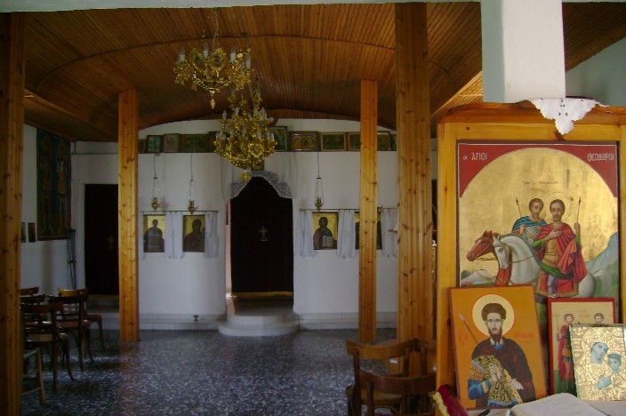 Το εξωκλήσι πρωτοχτίστηκε από κατοίκους του χωριού μετά τα πρώτα δύσκολα χρόνια της προσφυγιάς, γύρω στα 1950. Θεμελιώθηκε κοντά στον απόκρημνο βράχο που βρίσκεται λίγο πιο κάτω, προς τη μεριά της λίμνης. Εκεί, στην Πέτρα – όπως καθιερώθηκε να λέγεται – υπάρχει μια διαμπερής σπηλιά, όπου σύμφωνα με μαρτυρίες, υπήρχε εικόνα των Αγίων Θεοδώρων.